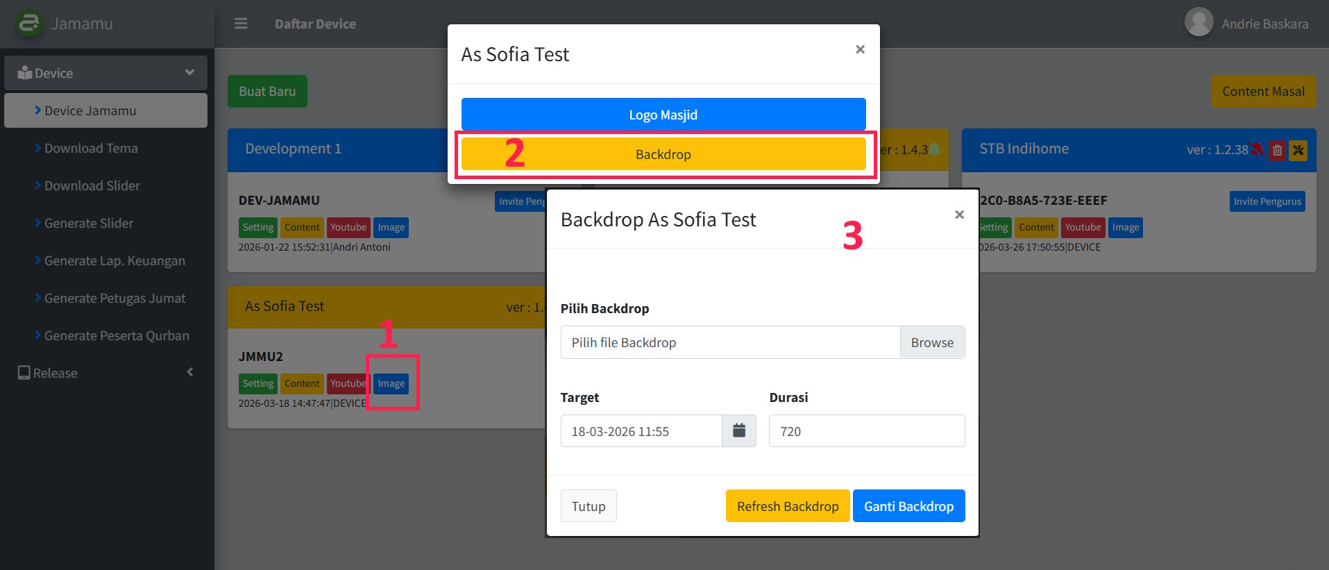 3. Apabila dari  device telah berhasil dijalankan, fitur backdrop dapat diatur dari Web Setting. Dari menu web setting dapat diatur image backdrop, target dan durasinya. Untuk menggunakan fitur di web setting, dapat dilakukan dari list Device Jamamu dengan klik tombol Image (Gambar 2 point 1) dan akan muncul list yang salah satunya adalah Backdrop (Gambar 2 point 2) setelah itu akna muncul form seperti gambar 2 point 3. Ketika klik tombol Ganti Backdrop maka sistem akan menyimpan data dan akan mengirimkan perintah ke device untuk mengambil data terbaru dari web setting.