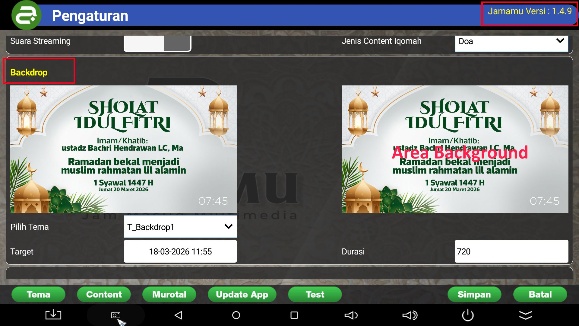 Alhamdullilah, setelah sekian lama Jamamu hadir, pada kesempatan ini Jamamu memperkenalkan fitur backdrop. Fitur ini berguna pada saat terdapat acara di masjid seperti kajian, sholeat Ied atau hal lainnya. Pada fitur ini, jamamu dapat difungsikan dengan  gambar freeze yang sesuai dengan acara. Bagaimana fitur ini bekerja ?